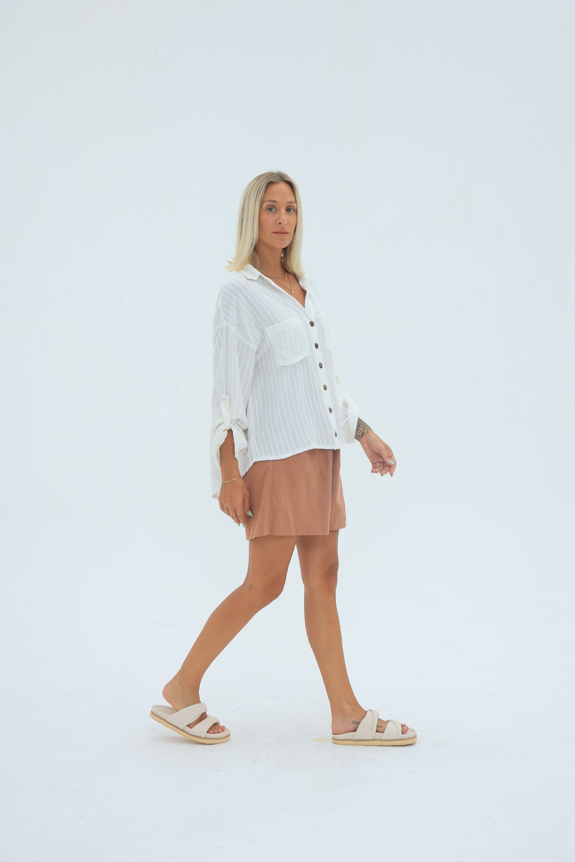 Get the best of both worlds with the Carbon Caitlyn Linen Stripe Shirt. Made from premium lightweight linen, this button-front shirt offers a breathable fit, while its 7/8 sleeves and soft collar add a touch of polished comfort. Plus, its natural tone effortlessly complements any outfit. Handmade with a front pocket for added convenience.