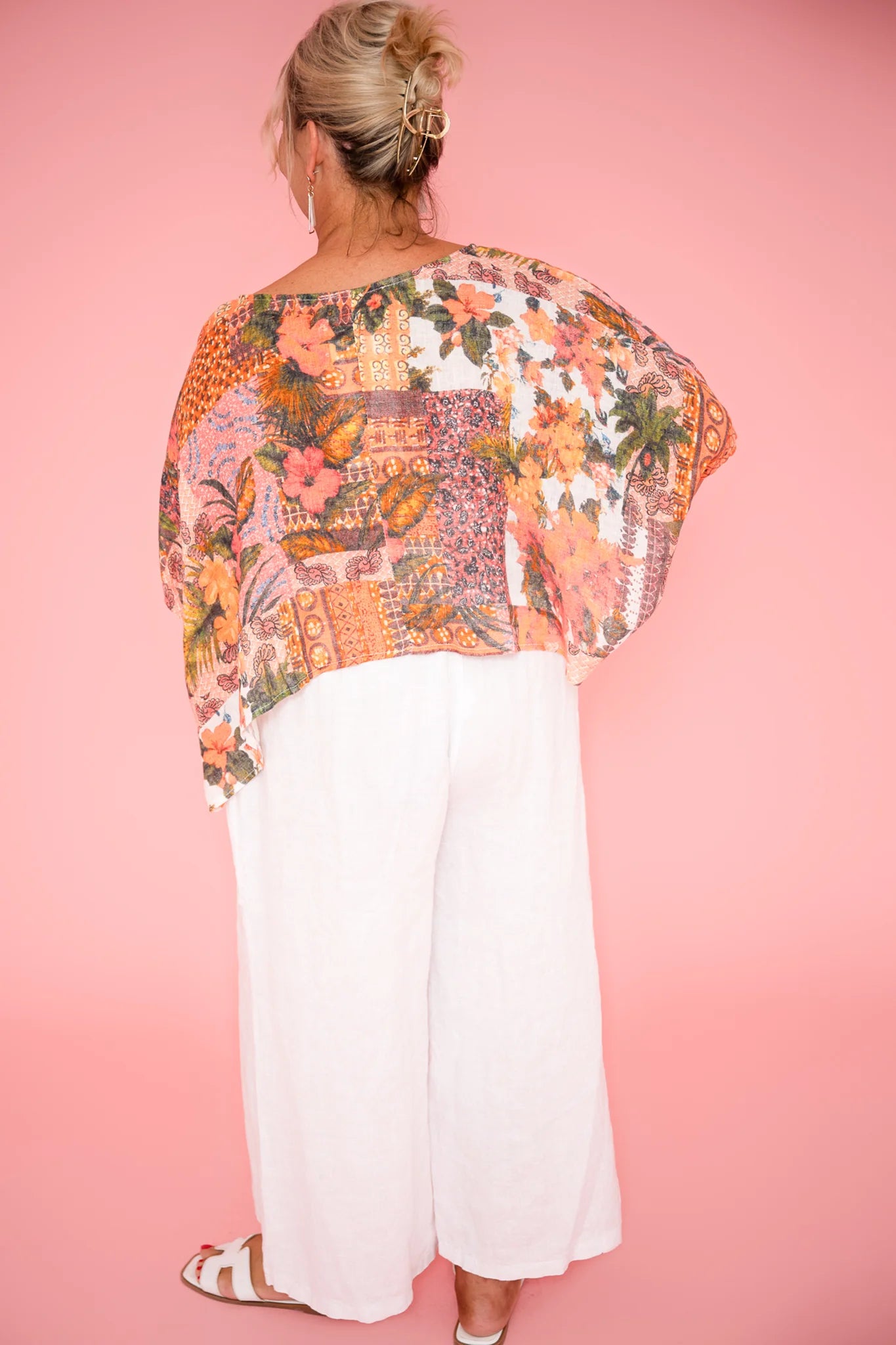 Turn heads with our Havana Print Tuscan Top – where latin-inspired artistry meets casual sophistication. This bold reinvention of our customer favourite showcases a kaleidoscope of coral and orange hues woven through exotic florals and striking geometric patterns that tell stories of distant shores.