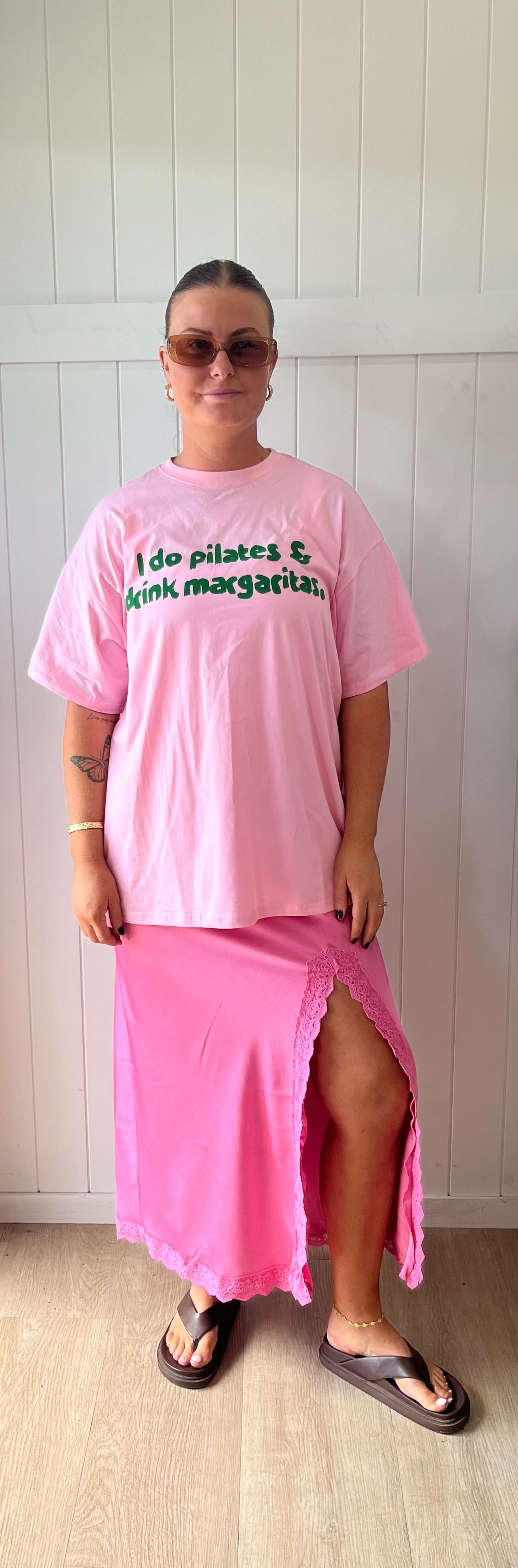 Ebby & I Chantelle pink skirt. spilt up the side, with embroidered detail on the spilt.