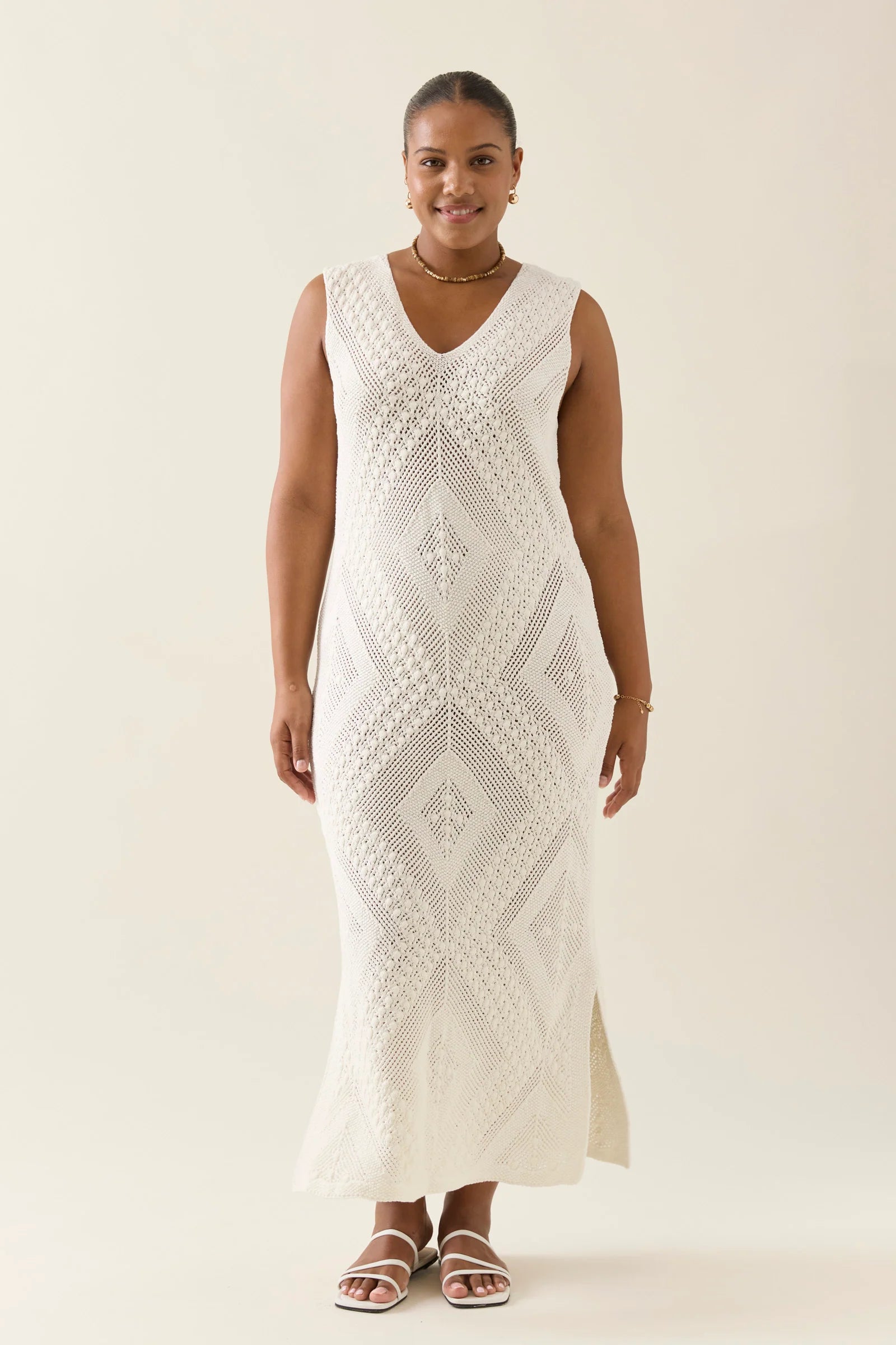 A sleeveless summer knit with laid-back polish, the Sylvie Dress features a flattering V-neckline, side splits and subtle diamond texture. Its 7/8 length makes it perfect for day-to-night ease.